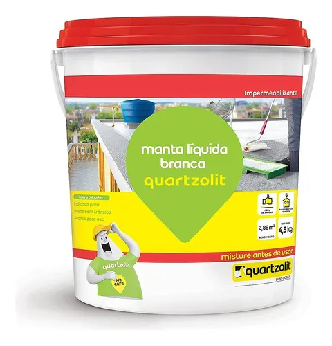 A manta líquida branca Quartzolit é um impermeabilizante flexível e elástico para lajes e coberturas com ou sem trânsito, como lajes de concreto armado e telhas de fibrocimento e telhas cerâmicas. Após secagem, forma uma membrana de alta resistência química. Impermeabilizante flexível de fácil aplicação resistente aos raios ultravioleta e às intempéries, acomoda pequenas movimentações da estrutura, baixa absorção de água em longos períodos, mantém as propriedades em baixas temperaturas e baixa retenção de fuligem.